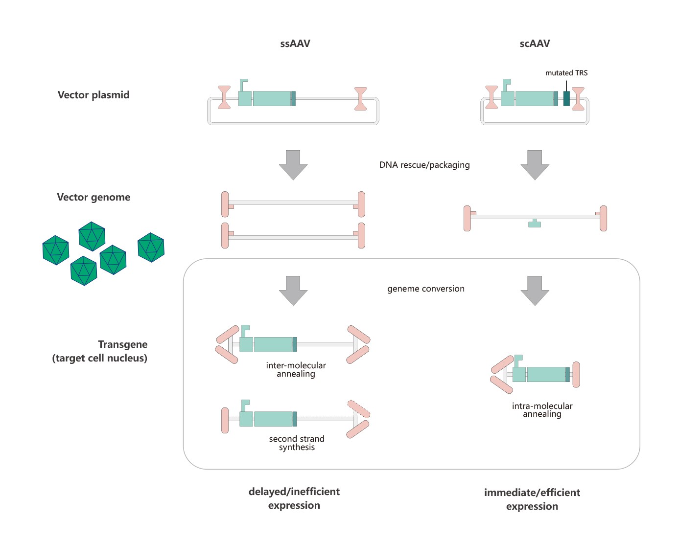 腺相关病毒(Adeno-associated virus)属于细小病毒科,Dependoparvovirus属,是目前发现的一类结构简单、无包膜的单链DNA缺陷型病毒,它的生命周期依赖于复制病毒的参与,如腺病毒和单纯疱疹病毒。野生型的腺相关病毒可以定点整合到人类第19号染色体的AAVS1位点,而重组腺相关病毒由于缺少整合和复制必需的两个基因而无法整合。因此,重组腺相关病毒主要以游离于染色体的附加体形式存在,并可长时间存在于非分裂细胞中。另外,腺相关病毒具有高组织特异性、良好的扩散性、低免疫原性、高安全性和稳定性。基于以上特点,重组腺相关病毒已经成为科研和基因治疗中具市场前景的病毒载体之一。